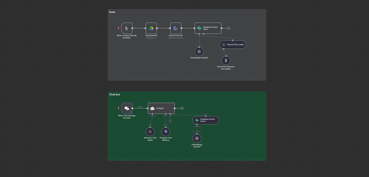 - Supabase Vector Store: Lưu trữ dữ liệu dưới dạng vector embeddings